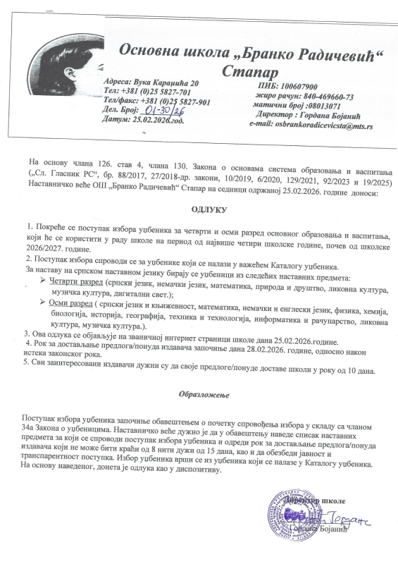 Одлука Наставничког већа о избору уџбеника за 4 и 8. разред за школску 2026/2027. годину