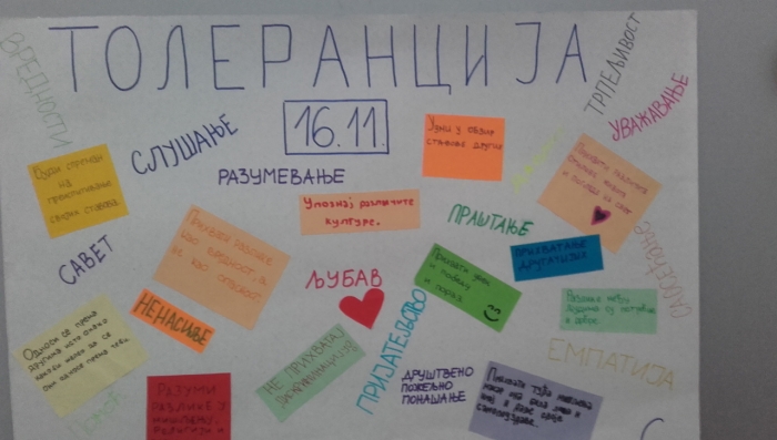 Међународни дан толеранције, 16. новембар, ученици 5/ 2 одељења су обележили кроз неколико радионица, у сардањи са одељењским старешином, Тамаром Бањац. Прва радионица била је шетња по дужима правоугаоника, тако да се не сударимо ни са ким.Само ако идемо у истом смеру, то је могло лако да се постигне. Друга радионица подразумевала је да на истом папиру и са једним фломастером,цртајући у пару,ученици нацртају две задате теме, не знајући да свако од учесника има различиту тему за цртање. Само најтолерантнији били су и најуспешнији! Трећа радионица састојала се од цртања предмета које друг из клупе набраја и то баш у одређеним деловима папира. Научили смо да се морамо слушати да бисмо се чули и разумели.