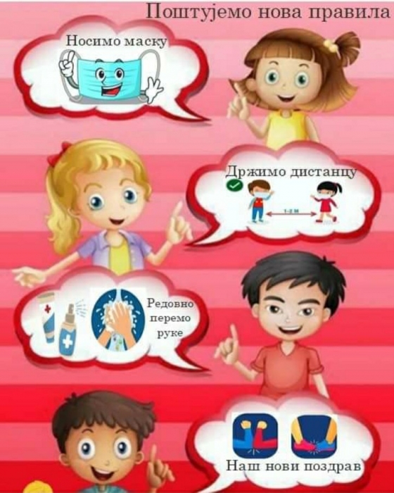 • Одржавање физичке дистанце међу ученицима неопходно је и током малих и великог одмора. Препоручује се да ученици проводе велики одмор на отвореном (у школском дворишту) кад год то временске прилике дозвољавају.
