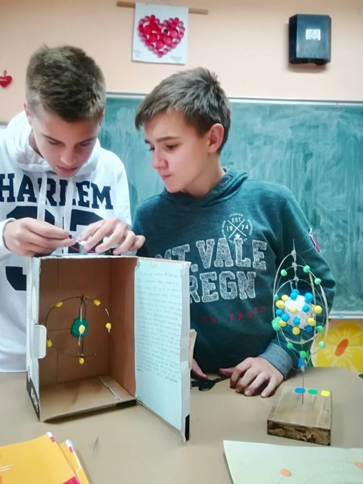 Ученици су у паровима помоћу различитих материјала (пластелин, жице, картона, куглица...) правили моделе атома елемената, а потом су радови изложени у холу школе како би се и осталим старосним групама могли приближити ови садржаји. Најбољи модел је повезан са електромоторем ради демонстрације кретање електрона у електронском омотачу, а аутори су похваљени.